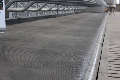 The solid top mat consists of 100% rubber. Thickness of the top mat is 4.5 mm. The top mat consists of a polyester weaving to prevent the mat from expanding. The top side of the top mat is made of a hammered profile, which optimises the grip. The top mat can be cleaned by means of a high pressure cleaner (max 120 bar).